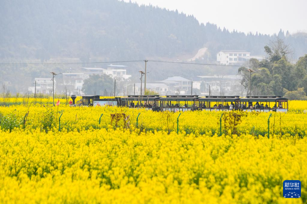 3月9日,游客乘坐“小火车”在重庆潼南崇龛花海景区游览。新华社记者 王全超 摄