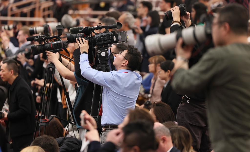 3月11日,第十四届全国人民代表大会第二次会议在北京人民大会堂举行闭幕会。这是记者在闭幕会上采访。新华社记者 刘续 摄