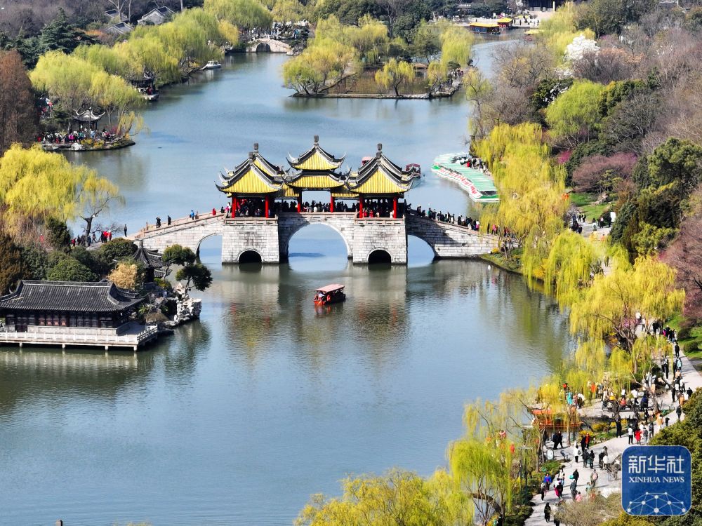 3月20日,游客在江苏扬州瘦西湖风景区游玩(无人机照片)。新华社发(孟德龙摄)