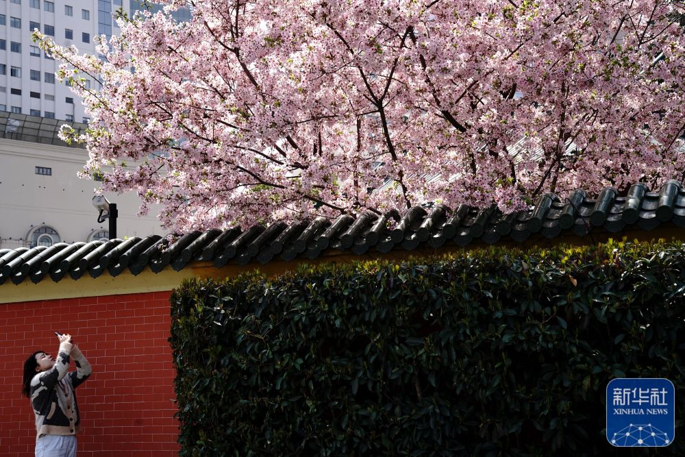 3月20日,一名市民在上海交通大学墙外拍摄樱花。新华社记者 张建松 摄
