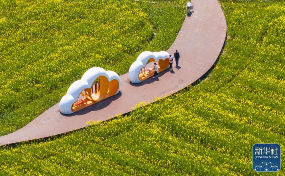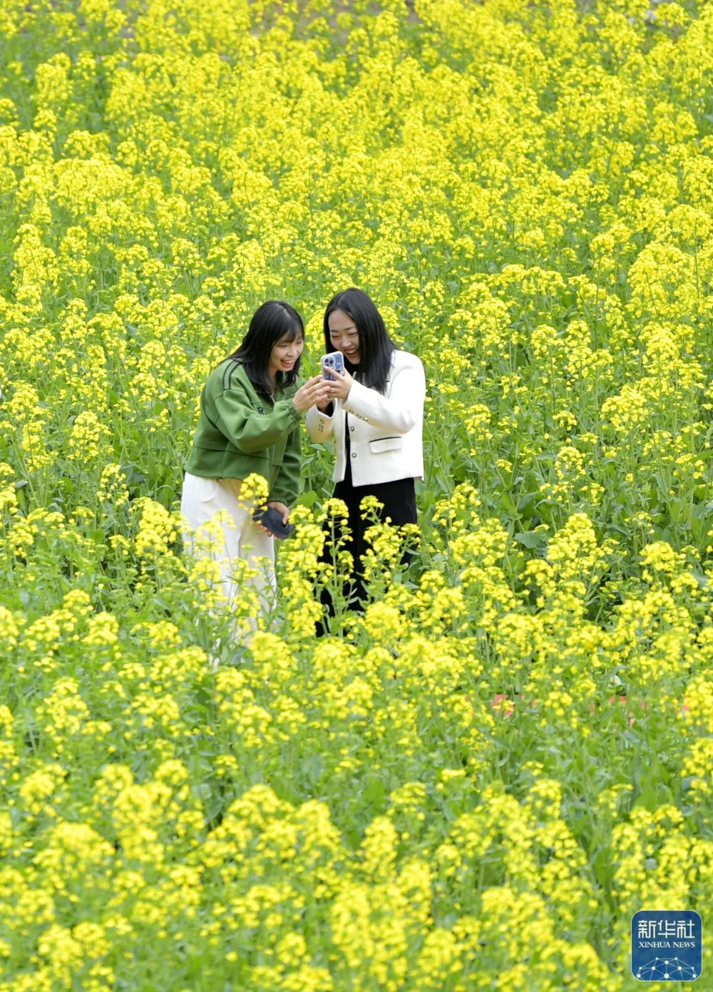 3月20日,游客在湖北省宣恩县万寨乡向家村的油菜花间游玩。新华社发(宋文摄)
