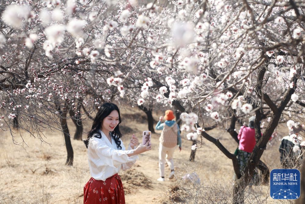 3月20日,游客在河北省邢台市内丘县杜家台村杏林内赏花拍照。新华社发(刘继东摄)