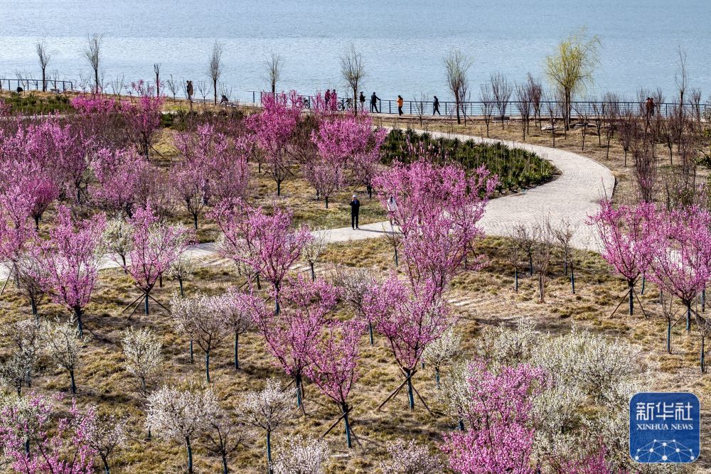 3月19日,市民在河南三门峡黄河岸边赏花。新华社发(杜杰摄)
