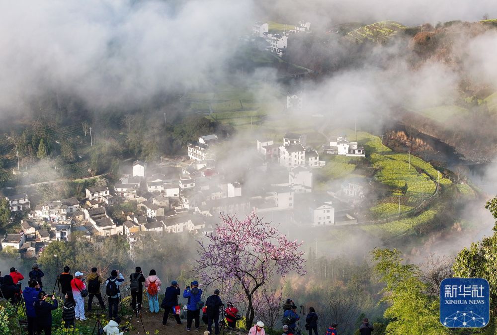 3月20日,游客在安徽省黄山市歙县霞坑镇石潭村欣赏春日美景(无人机照片)。新华社发(施亚磊摄)