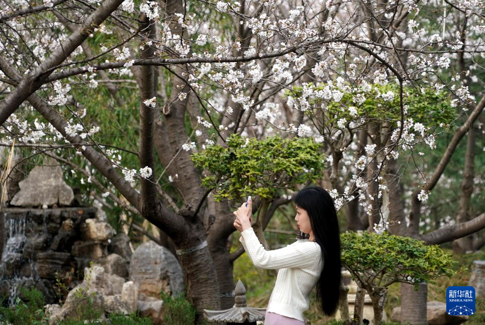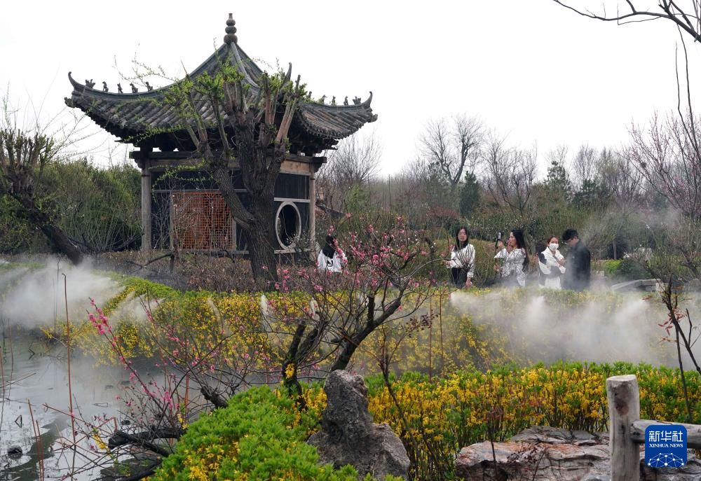 游客在位于河南省鄢陵县的一处园林内赏景拍照(3月26日摄)。新华社记者 李安 摄