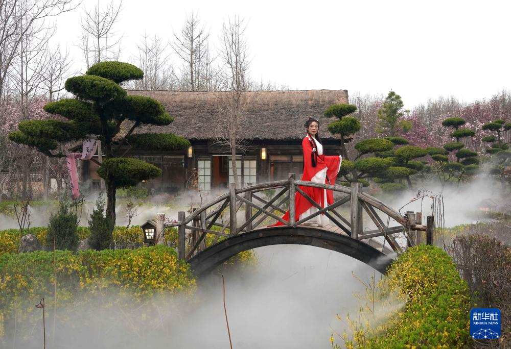 身着传统服饰的游客在位于河南省鄢陵县的一处园林内拍照(3月26日摄)。新华社记者 李安 摄