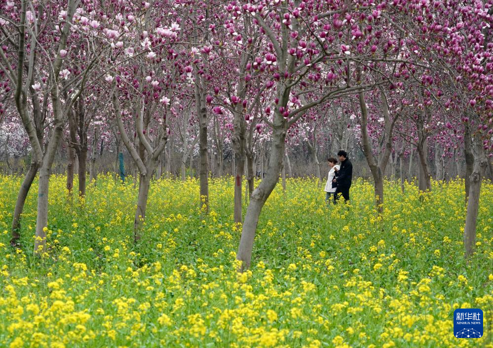 游客在位于河南省鄢陵县的一处园林内赏花游玩(3月26日摄)。新华社记者 李安 摄
