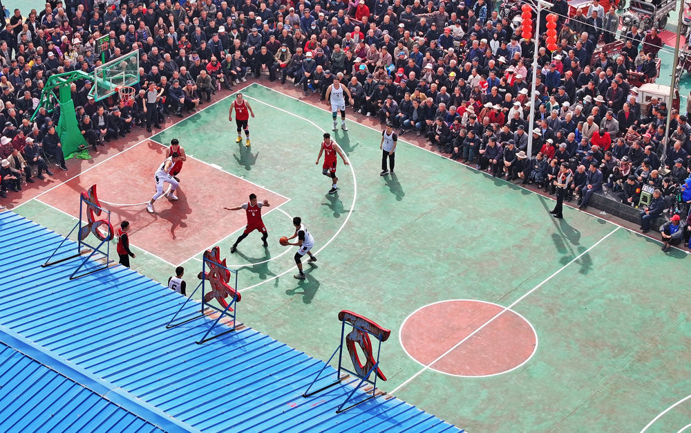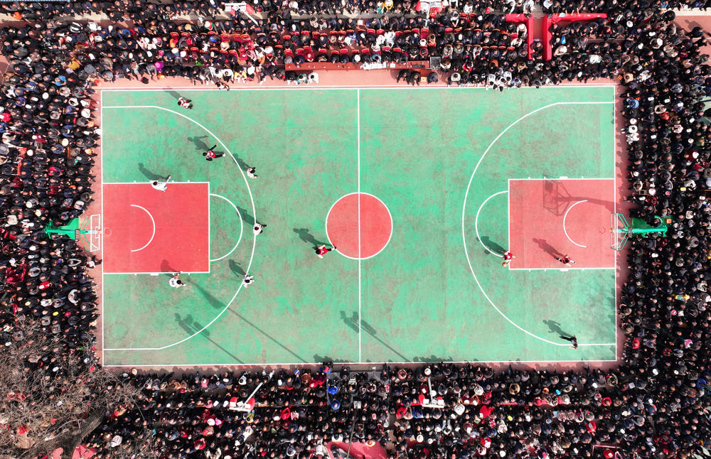 ↑2024年4月5日,山西省运城市新绛县,峨嵋岭上万安镇万安村举办“油桃杯”篮球邀请赛,选手们在比赛中。 (无人机照片)CICPHOTO/高新生 摄