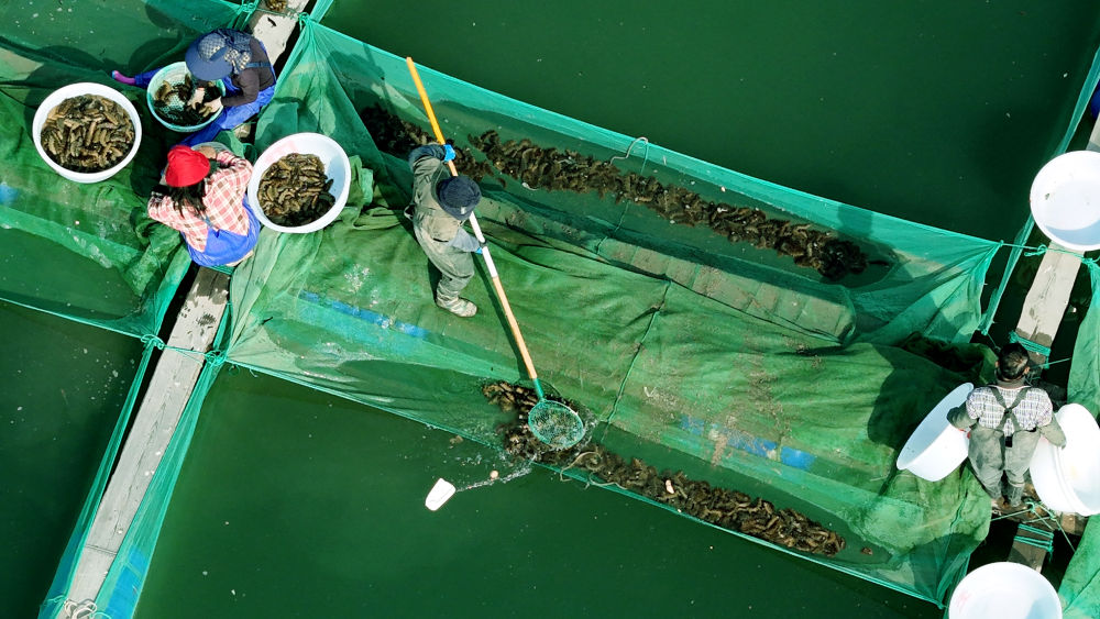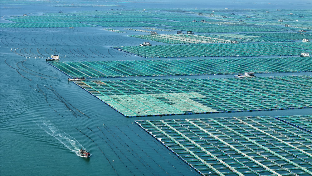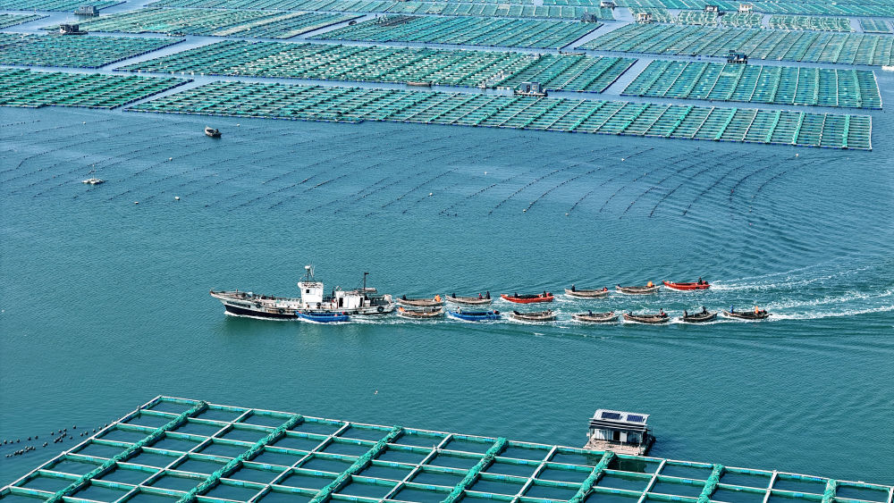↑2024年4月5日,山东省荣成市石岛管理区桑沟湾国家级海洋牧场,产业工人驾驶养殖船只穿梭于网箱养殖区捕捞春参。(无人机照片)CICPHOTO/杨志礼 摄