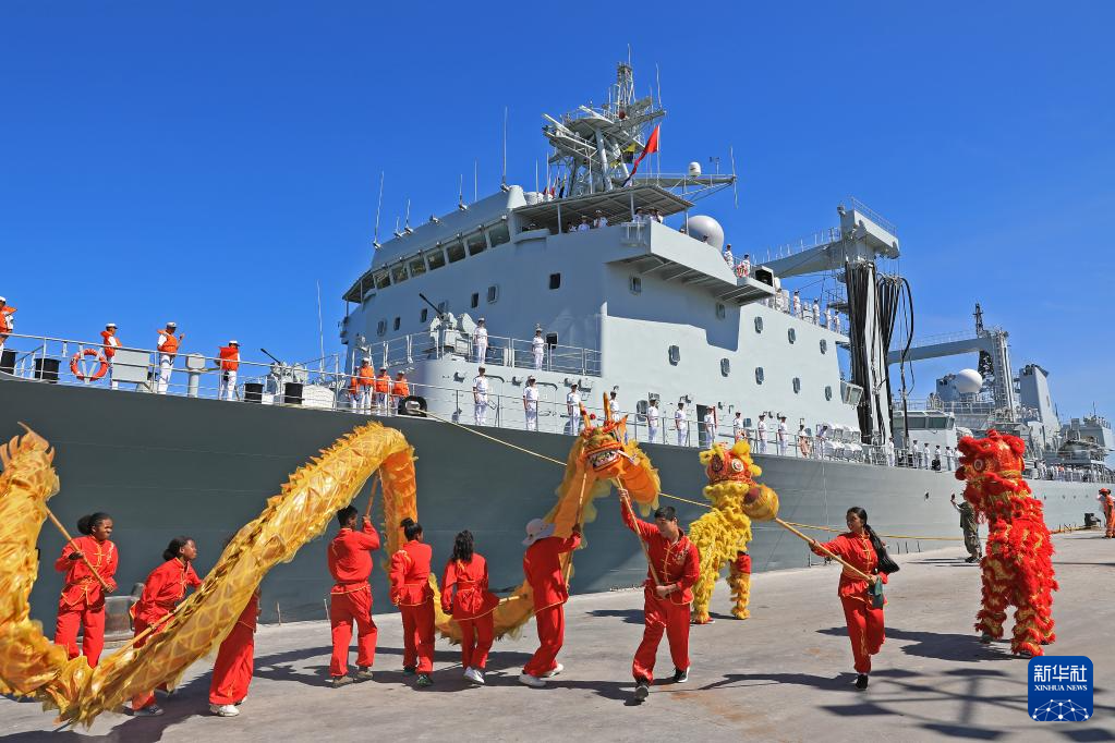 4月10日,中国海军第45批护航编队抵达马达加斯加进行友好访问,欢迎仪式上马方组织舞龙、舞狮表演。 新华社发(王远方摄)