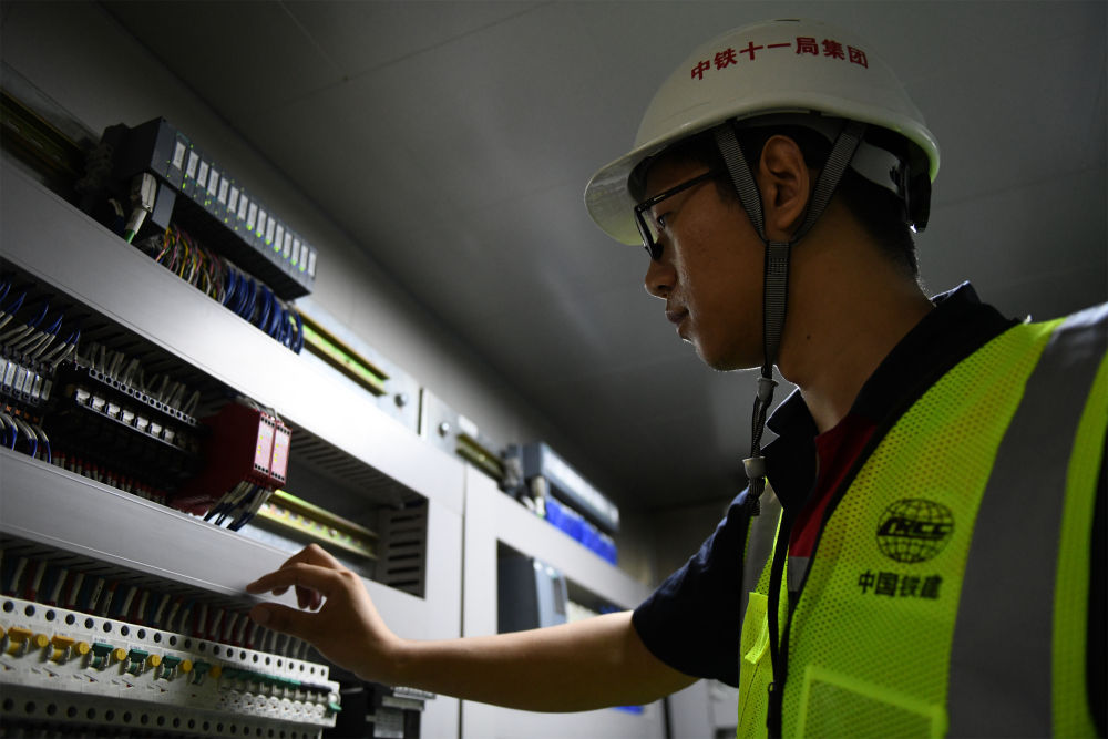 ↑4月25日夜,中铁十一局的工程师对“羊城号”的电器控制系统进行验收。新华社发(王荃荃 摄)