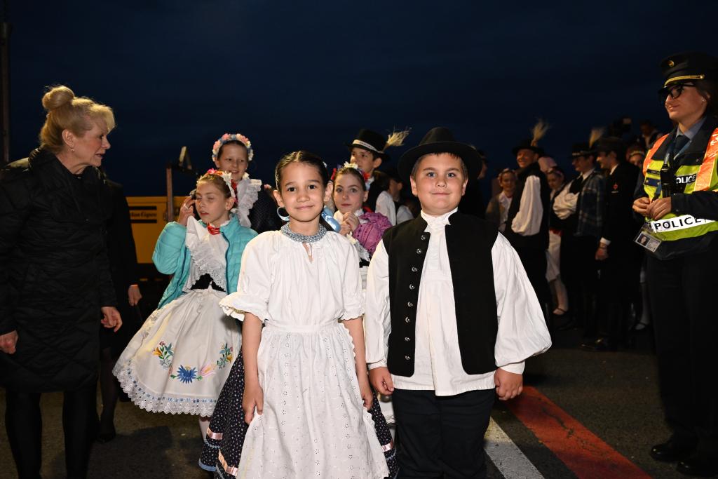 两名身着民族服装的匈牙利儿童向习近平主席夫妇献上面包和盐,用传统礼节欢迎最尊贵的客人。匈中双语学校的学生向习近平夫妇献花,并用中文说:“欢迎您来到匈牙利”。少年儿童跳起欢快的民族传统舞蹈查尔达什舞曲,向习近平表达最热烈的欢迎。