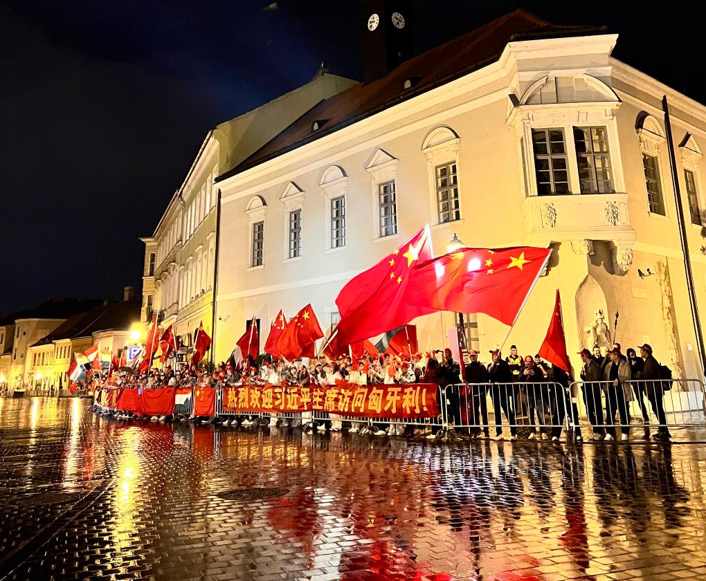 习近平乘车从机场赴下榻饭店途中,数百名当地华人华侨和中国留学生聚集在道路两旁,挥舞中匈两国国旗,举着横幅,热烈欢迎习近平主席到访。