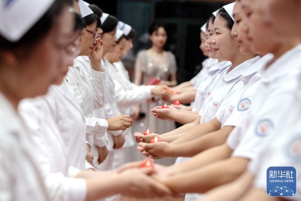 5月10日,浙江省湖州中等卫生专业学校,护理前辈、专业教师将象征“燃烧自己,照亮他人”的蜡烛传给护理专业学生。新华社发(谭云俸摄)