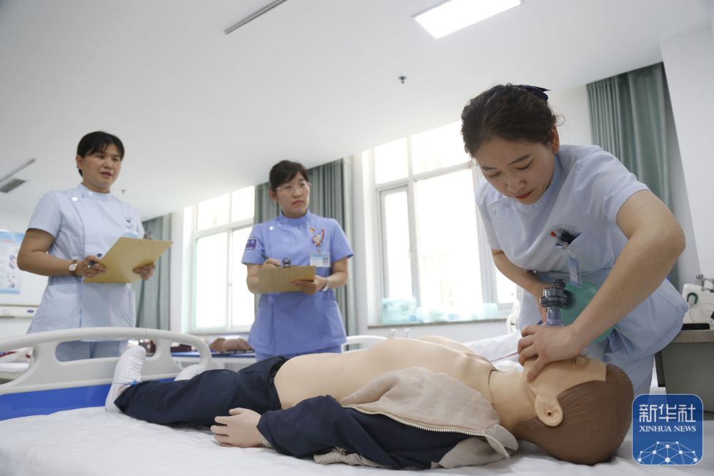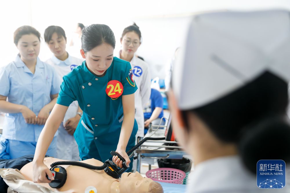 5月10日,河北省邢台医专第二附属医院的护士进行业务技能比赛。新华社发(张驰摄)