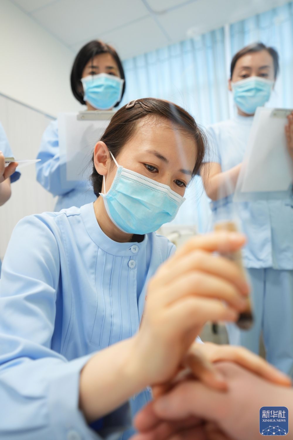 5月10日,山东省乐陵市中医院护士在进行中医艾灸护理操作技能比赛。新华社发(贾鹏摄)