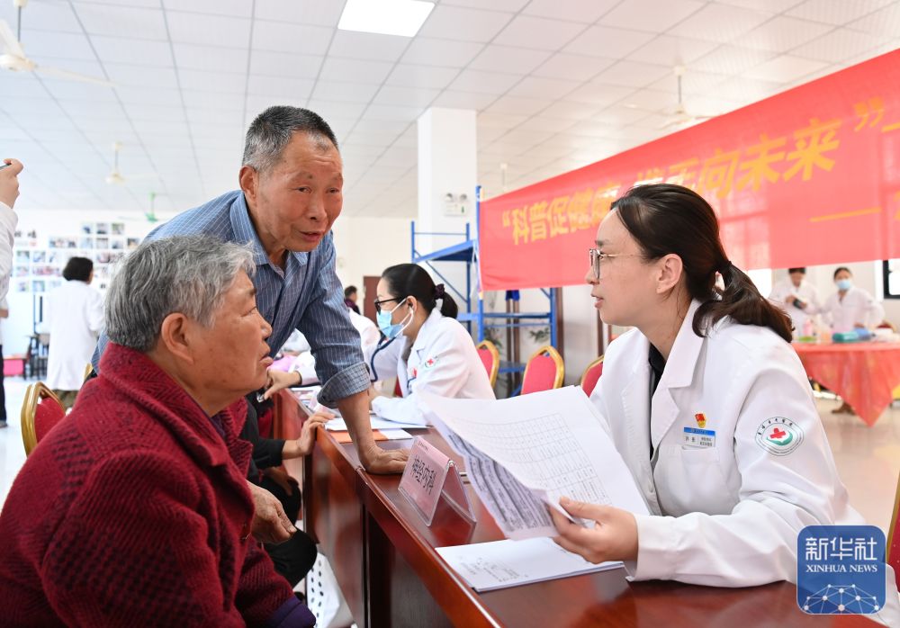 5月10日,浙江省东阳市中医院的医护人员在城东街道东锋村文化礼堂给居民进行健康义诊。新华社发(包康轩摄)