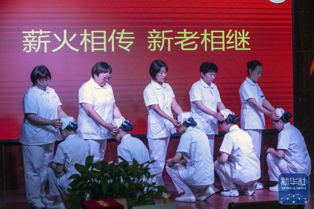 5月10日,在河南省焦作市博爱县中医院举行的薪火相传仪式上,资深护理人员为新护士授帽。新华社发(程全摄)