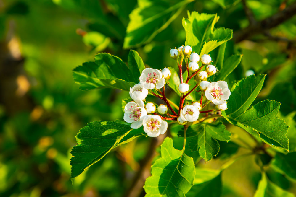 ↑2024年5月3日在河北省唐山市一处校园拍摄的山楂花。CICPHOTO/刘柬林 摄