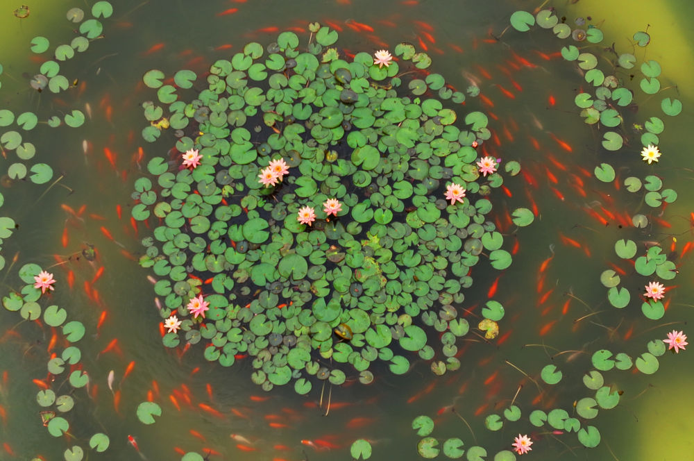 ↑2024年5月7日,湖南省衡阳市,南华大学校园池塘里的睡莲盛开。(无人机照片)CICPHOTO/曹正平 摄