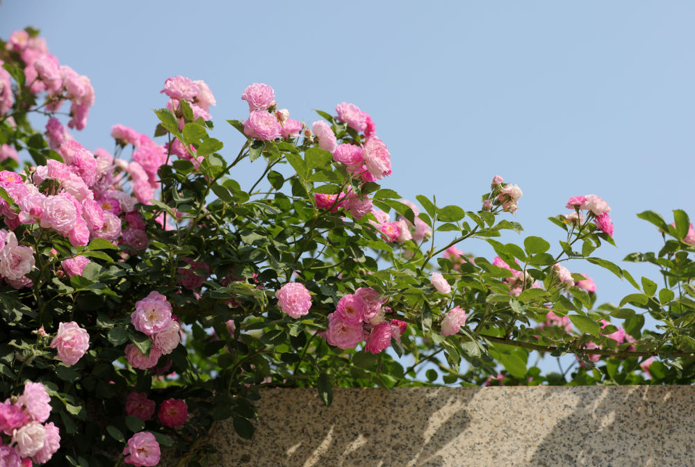 ↑2024年5月7日在河北省邢台市广宗县第二中学围墙外拍摄的蔷薇花。CICPHOTO/王垒 摄