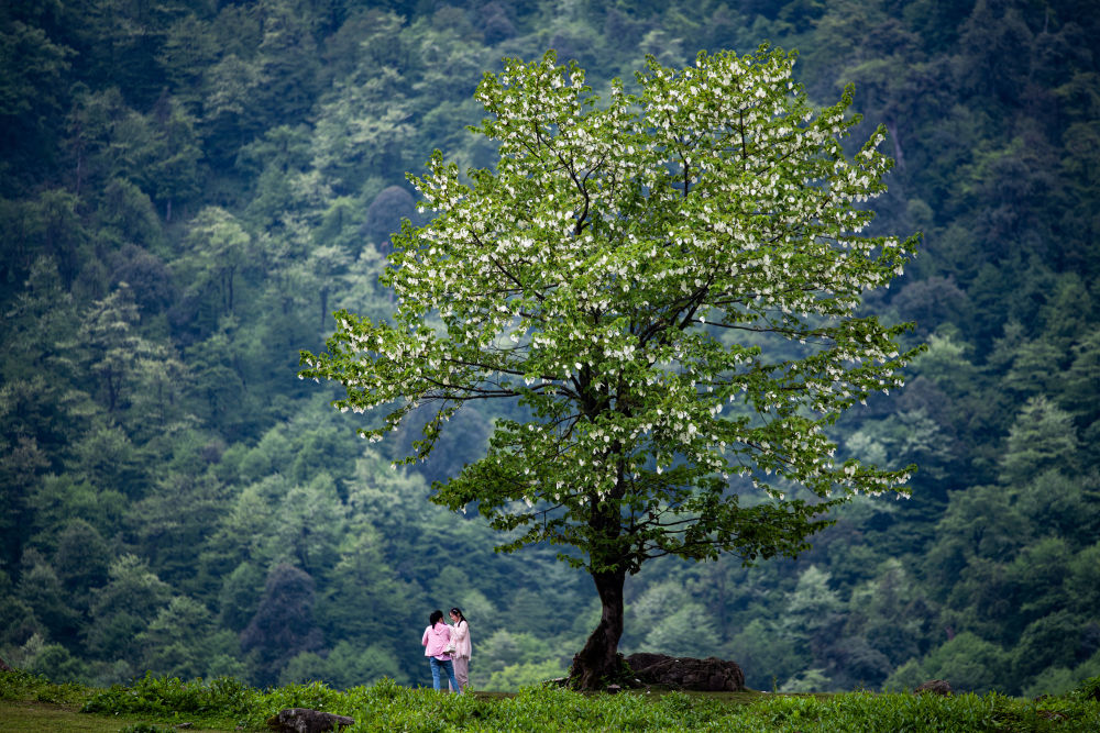 ↑2024年5月6日,四川省乐山市峨边彝族自治县黑竹沟,被誉为“植物界大熊猫”的珙桐开花满枝头。CICPHOTO/孔胜 摄