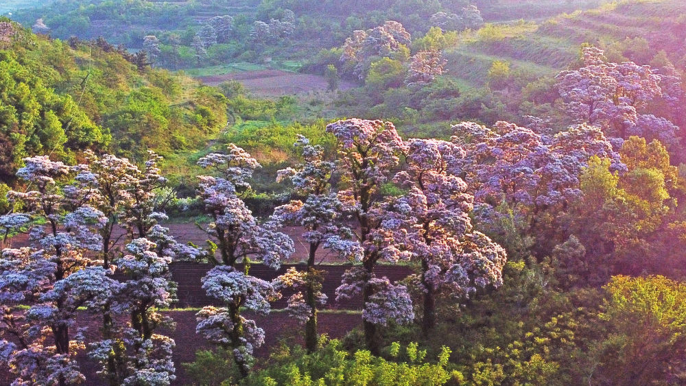 ↑2024年5月8日,山东省荣成市伟德山麓,楸树花开分外娇美。CICPHOTO/王福东 摄