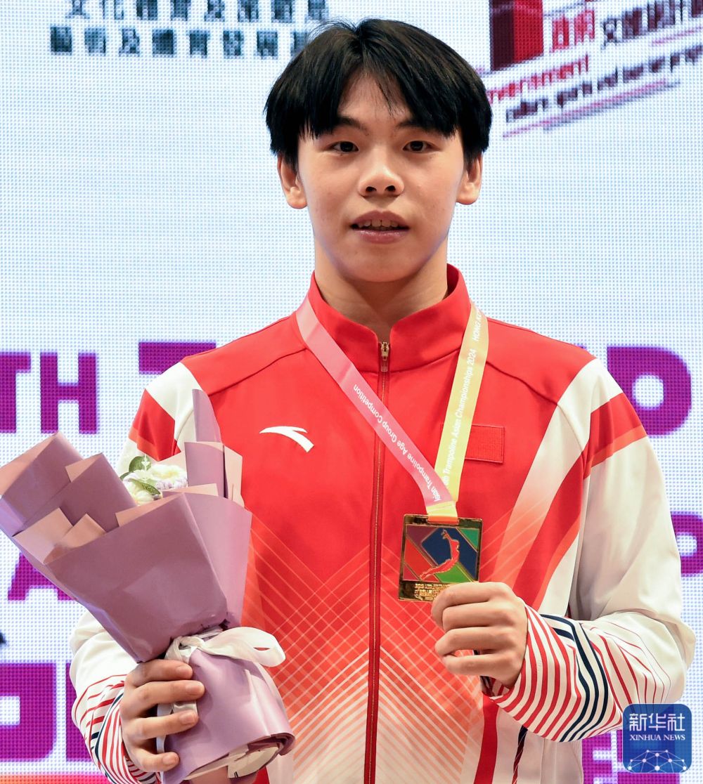 ⬆️中国运动员喻炜杰在男子青年组决赛后的颁奖仪式上,他以57.630分的成绩获得冠军。