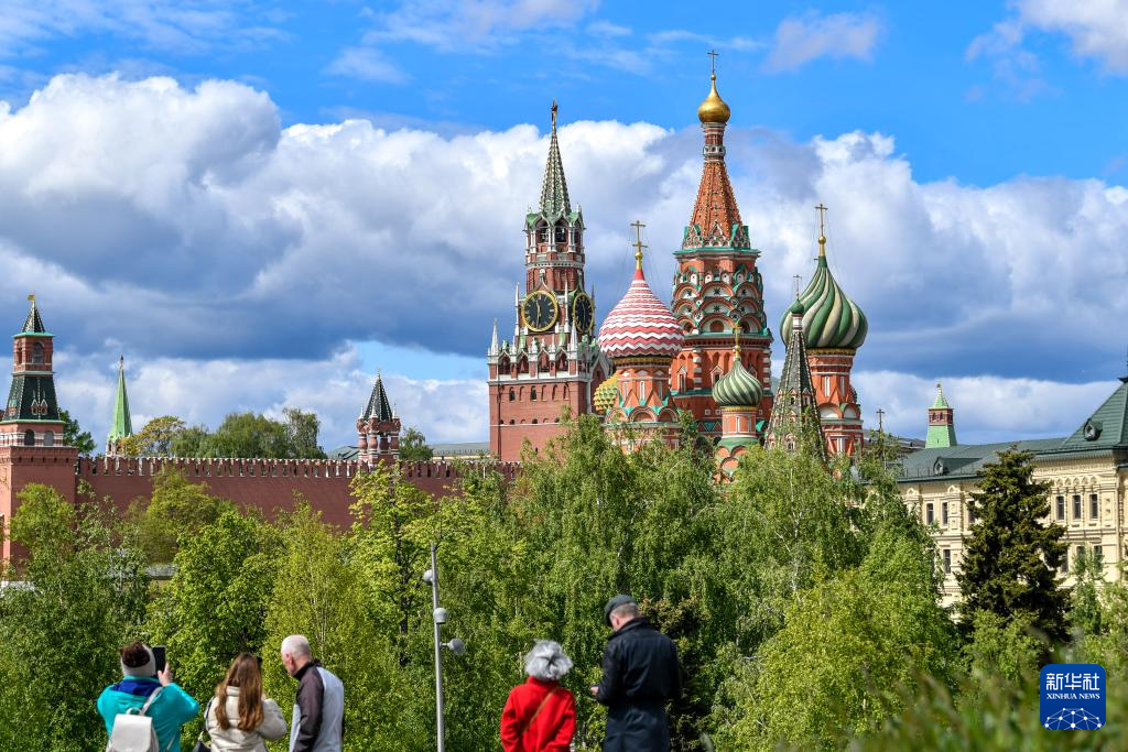 这是5月11日在俄罗斯首都莫斯科拍摄的克里姆林宫和圣瓦西里教堂。新华社记者 曹阳 摄