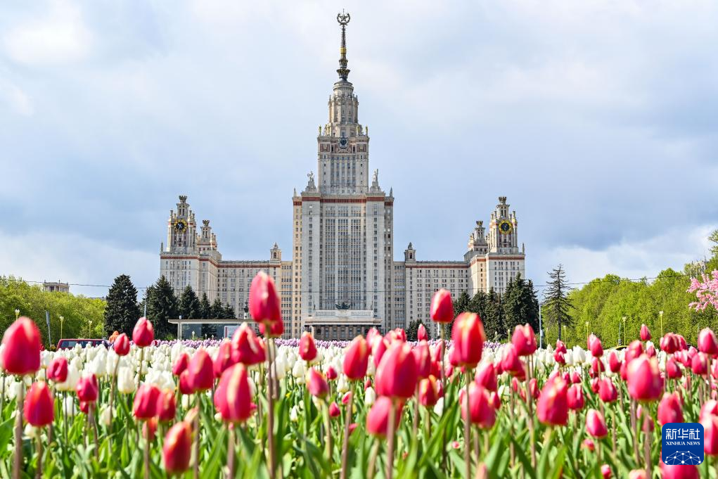 这是5月8日在俄罗斯首都莫斯科拍摄的莫斯科大学主楼。新华社记者 曹阳 摄