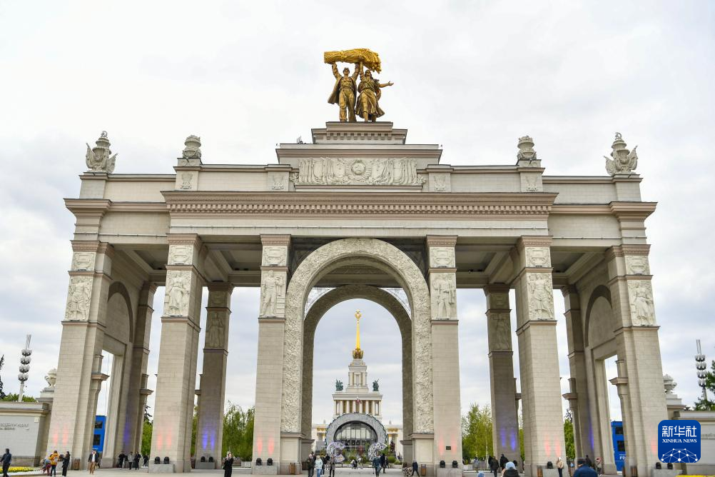 这是5月13日在俄罗斯首都莫斯科拍摄的国民经济成就展览馆。新华社记者 曹阳 摄