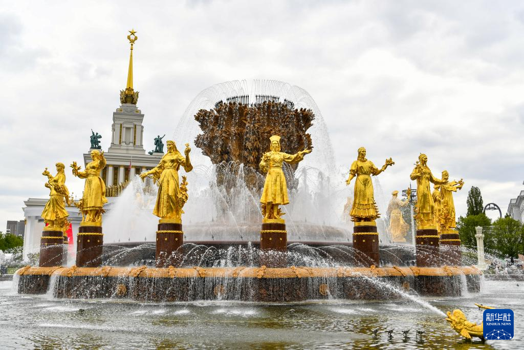 这是5月13日在俄罗斯首都莫斯科拍摄的国民经济成就展览馆的喷泉。新华社记者 曹阳 摄
