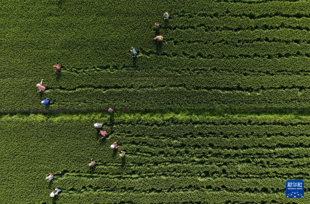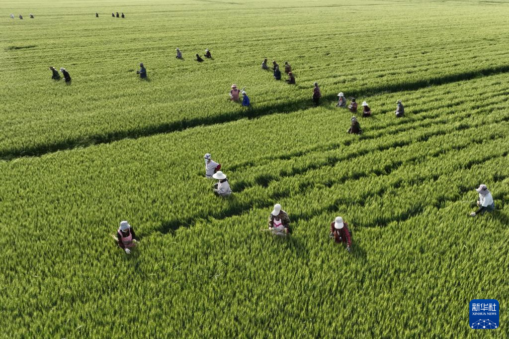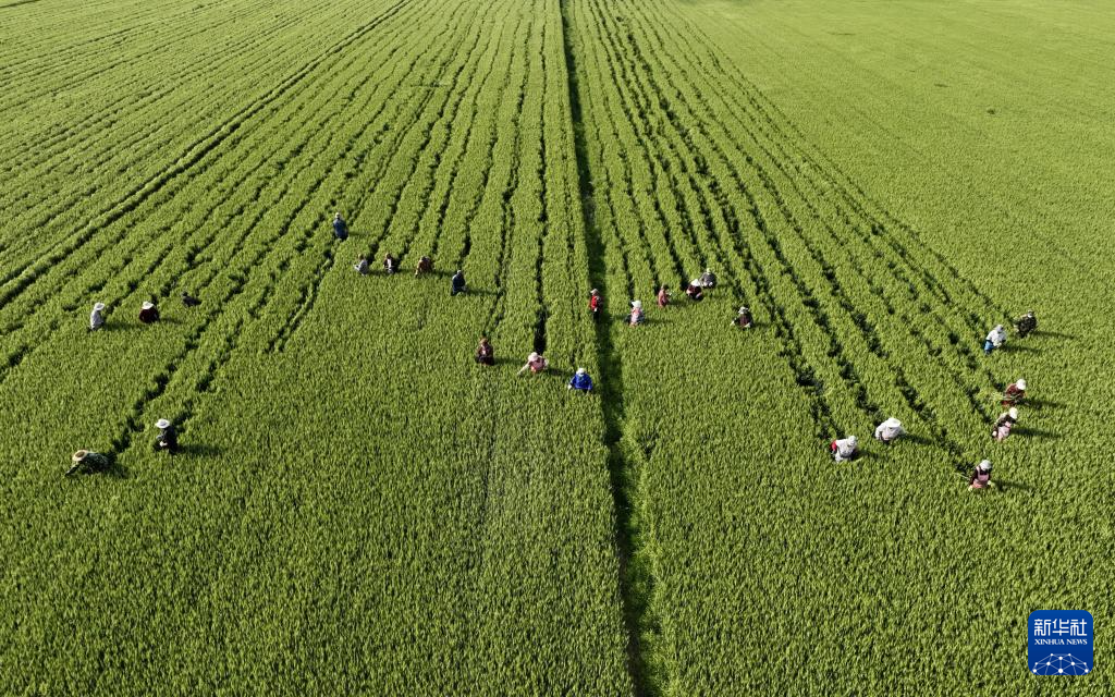 5月16日,河北省晋州市槐树镇北白水村的农民在麦种田内剔除杂穗(无人机照片)。新华社记者杨世尧摄