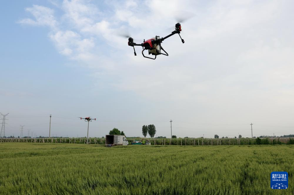 5月16日,河北省晋州市槐树镇北白水村的农民在麦田内使用无人机进行“一喷三防”作业。新华社记者杨世尧摄