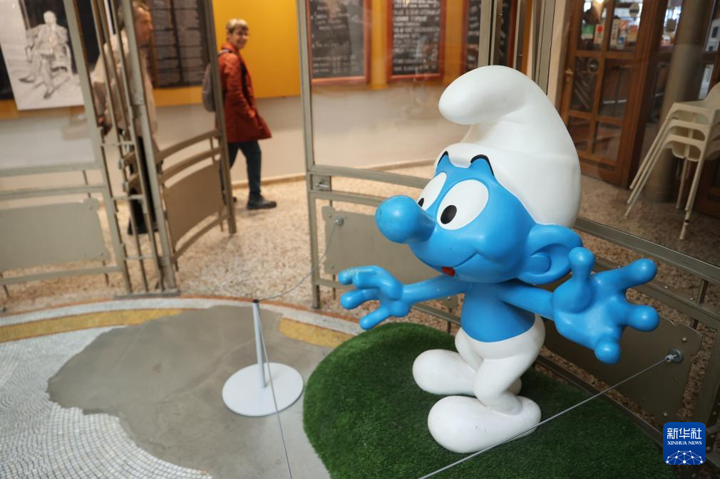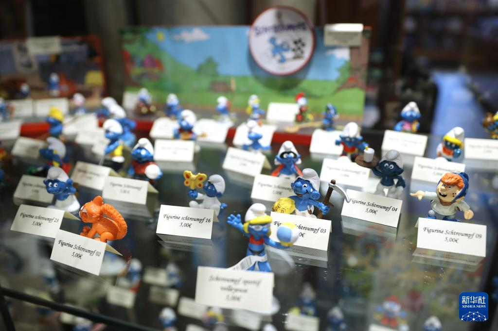 这是5月18日在比利时布鲁塞尔的漫画博物馆拍摄的蓝精灵玩偶。新华社记者 赵丁喆 摄