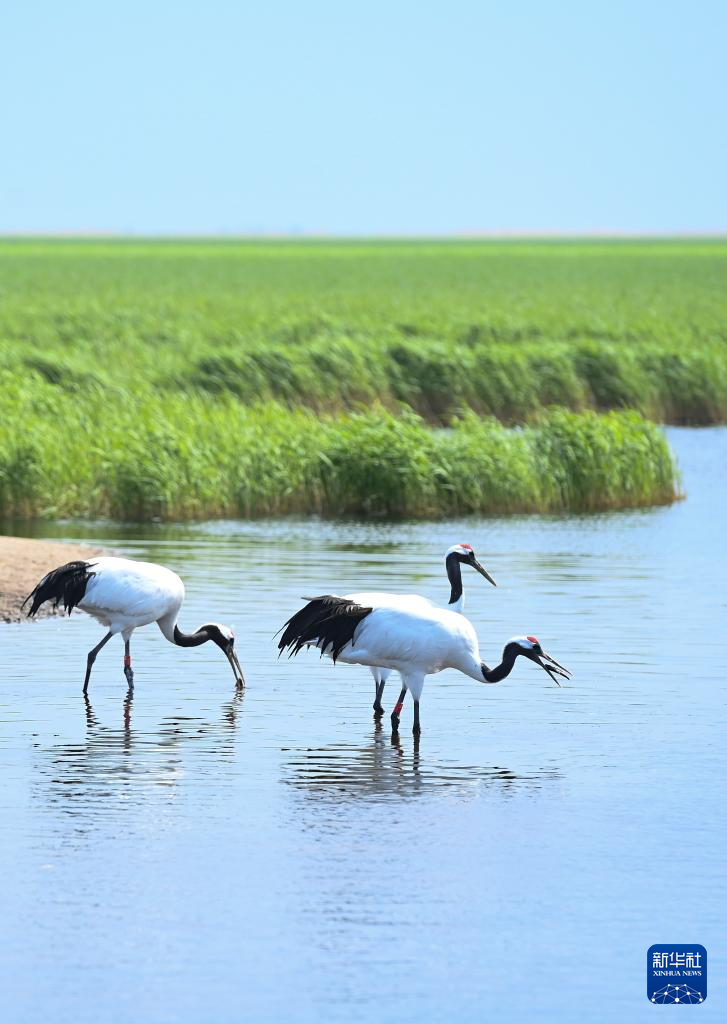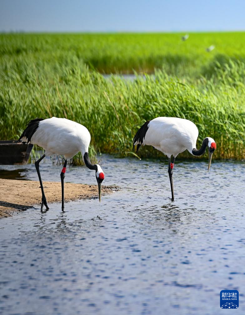 5月21日,在扎龙国家级自然保护区,丹顶鹤在水中觅食。新华社记者 蔡湘鑫 摄