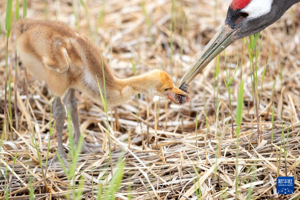 5月21日,在扎龙国家级自然保护区,丹顶鹤在给雏鹤喂食。新华社记者 张涛 摄