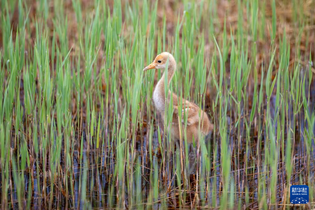 这是5月21日拍摄的扎龙国家级自然保护区内的一只雏鹤。新华社记者 张涛 摄
