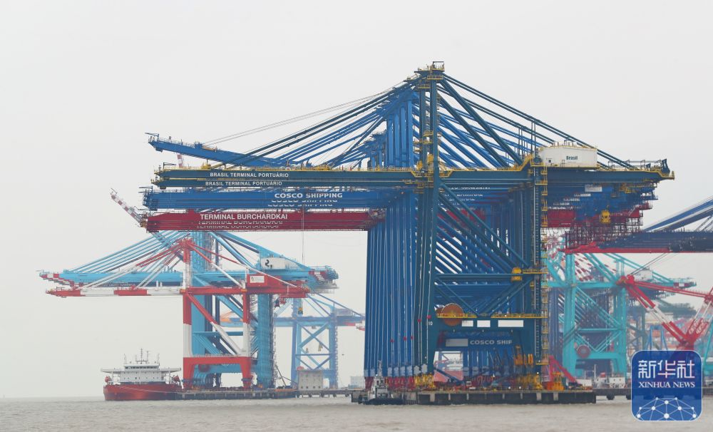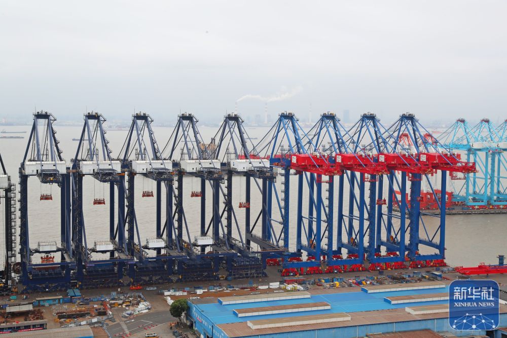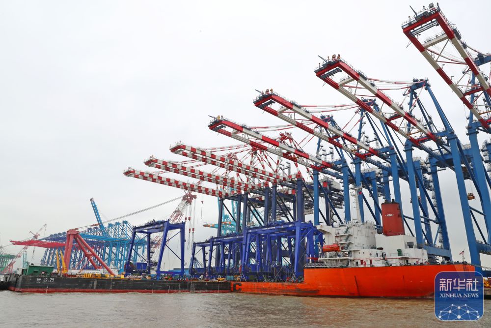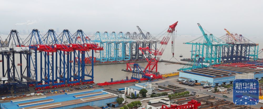 ↑这是5月25日在上海长兴岛上的上海振华重工长兴基地拍摄的岸边集装箱起重机(岸桥)。新华社记者 龚兵 摄