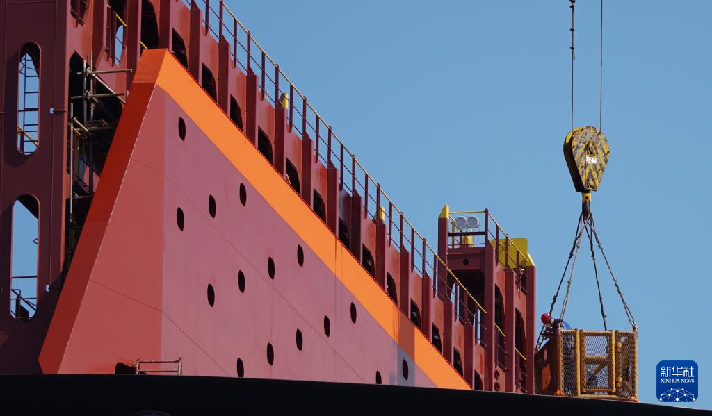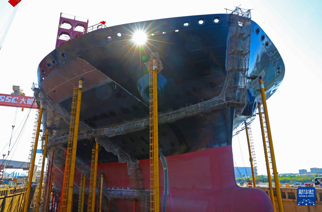6月15日,在中国船舶集团大连船舶重工集团有限公司拍摄的制造中的16000TEU集装箱船。新华社记者杨青 摄