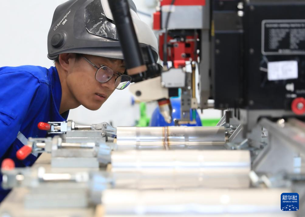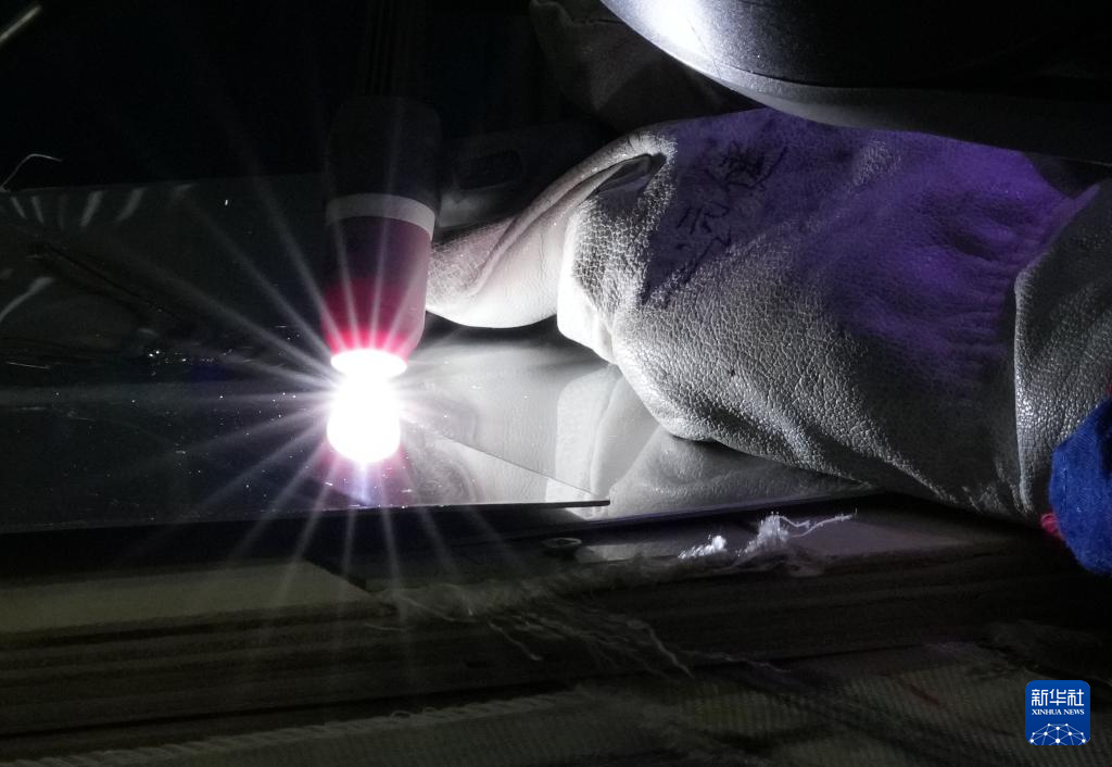 6月15日,中国船舶集团大连船舶重工集团有限公司LNG综合培训中心,一名学员在练习波纹板自动焊接作业。新华社记者杨青 摄