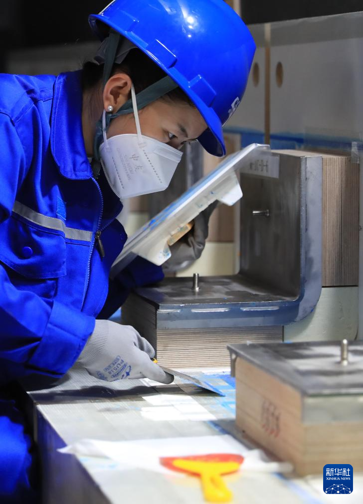 6月15日,中国船舶集团大连船舶重工集团有限公司LNG综合培训中心,一名学员在练习次屏壁手工粘连作业。新华社记者杨青 摄