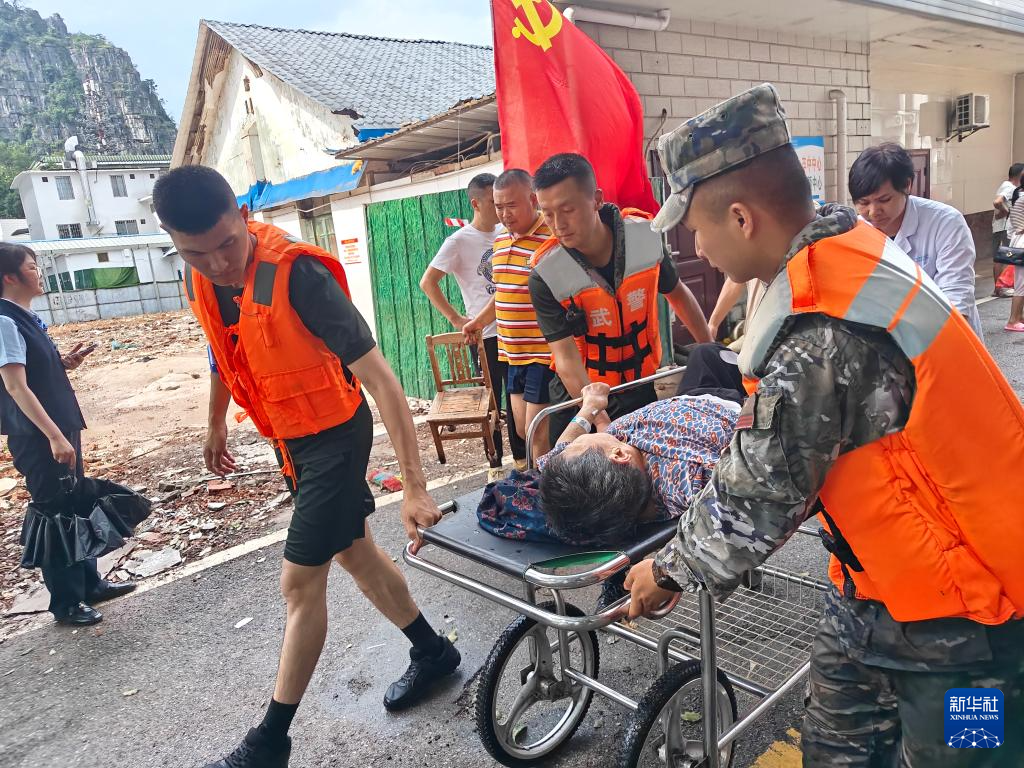 6月20日,广西桂林市七星区人武部出动民兵在七星街道施家园社区转移受灾群众。新华社发(阳京宏 摄)
