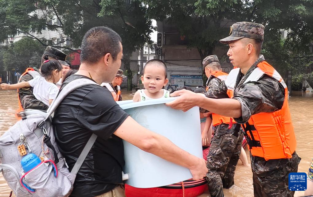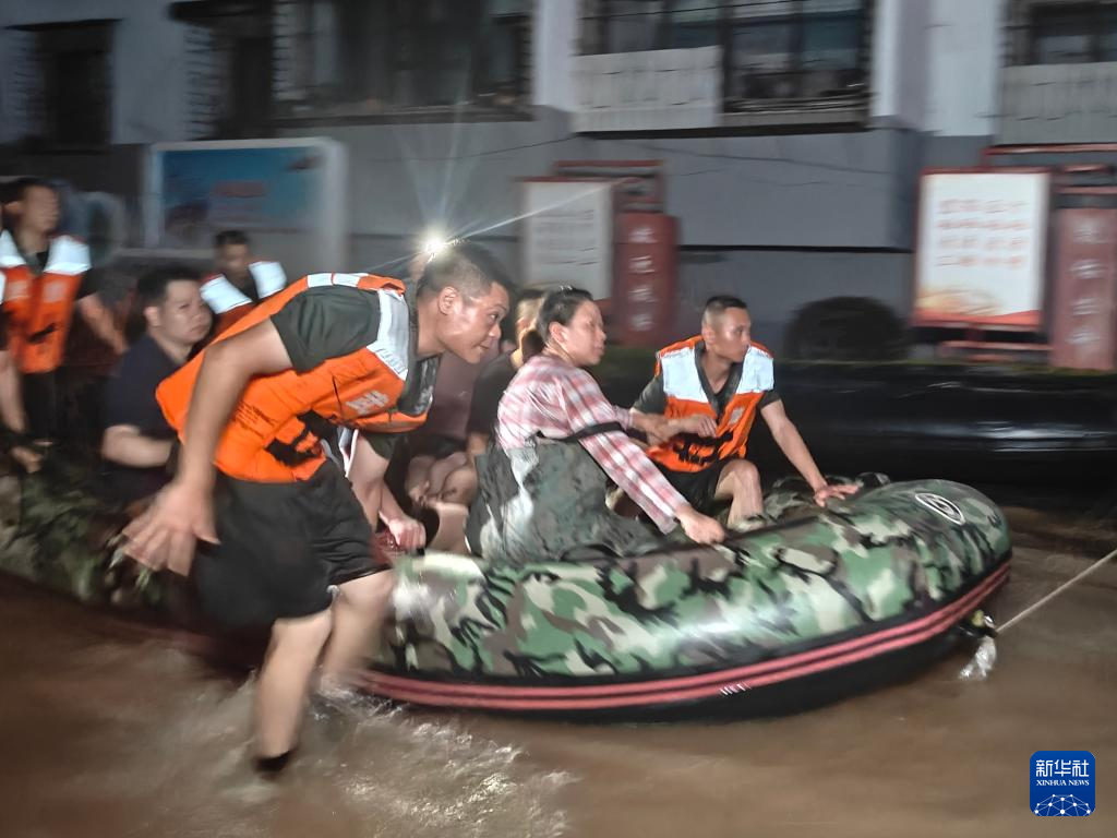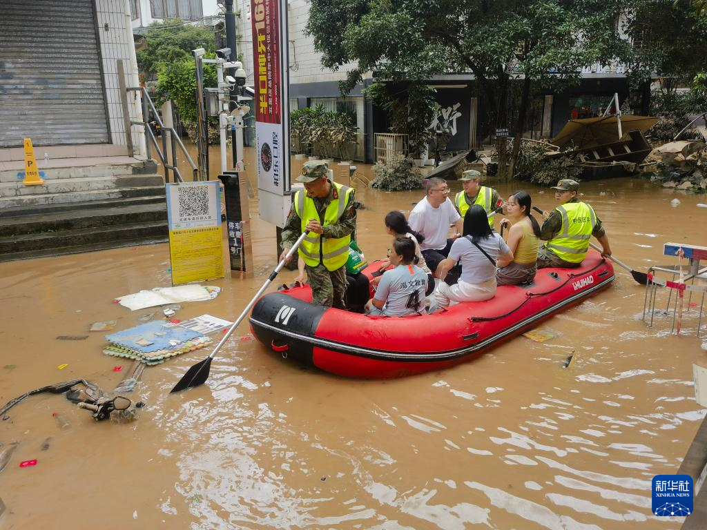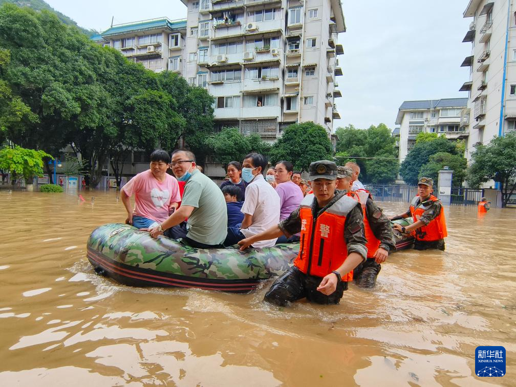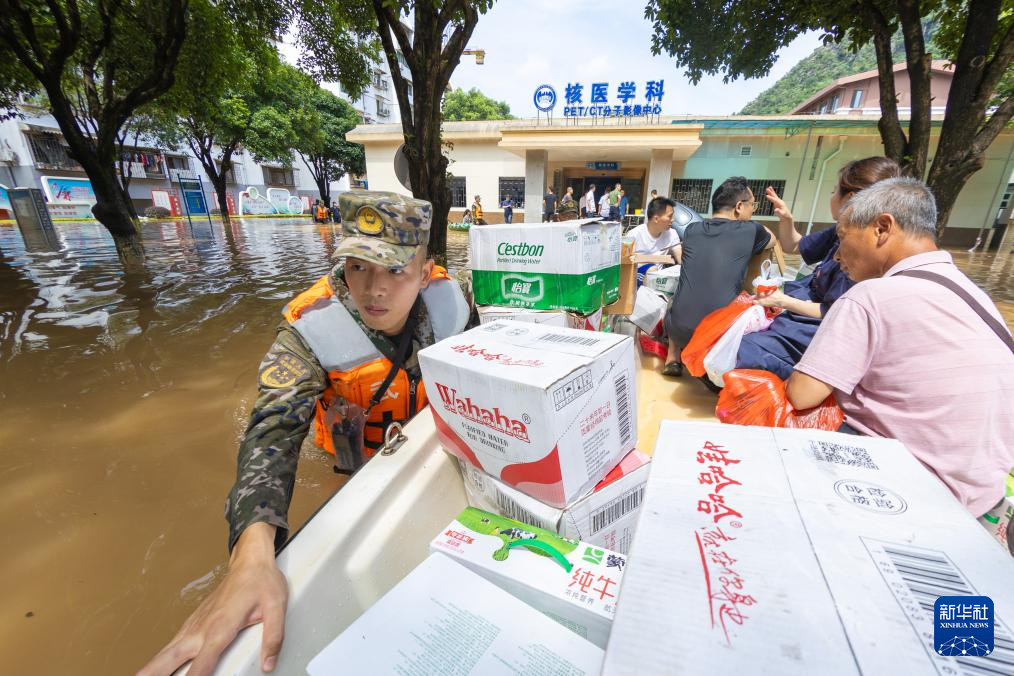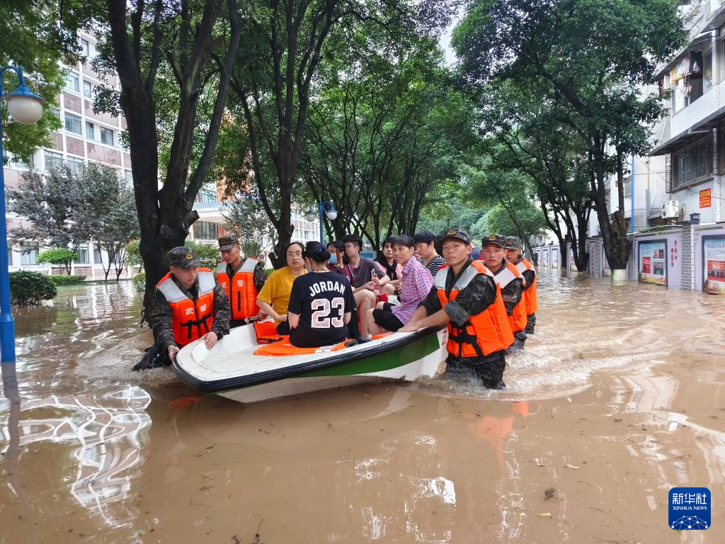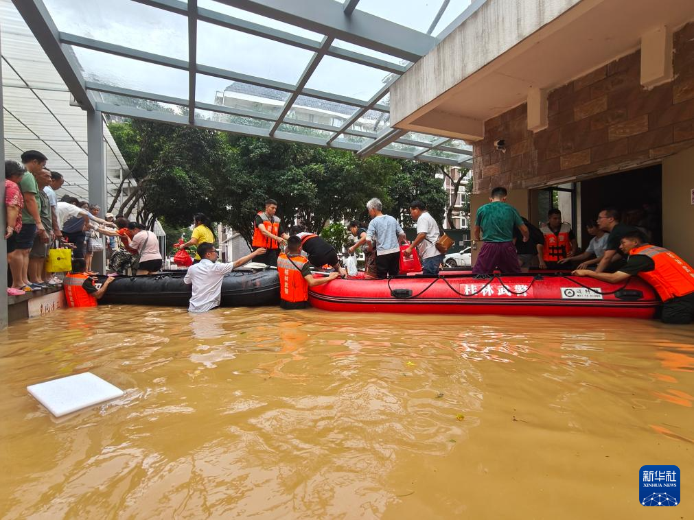 6月19日,武警广西总队桂林支队官兵在桂林市秀峰区九岗岭小区用冲锋舟转移受困群众。新华社发(张辰飞 摄)