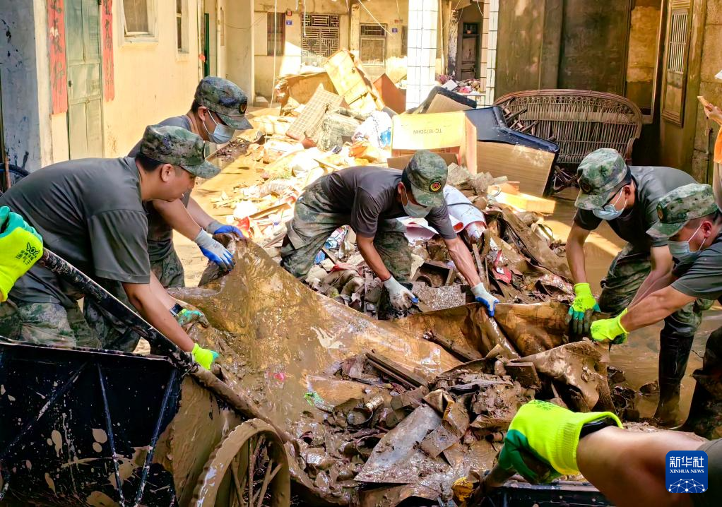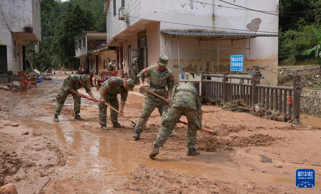 6月19日,广东省梅州市平远县人武部组织民兵清理灾区道路淤泥。新华社发(曾瑜 摄)