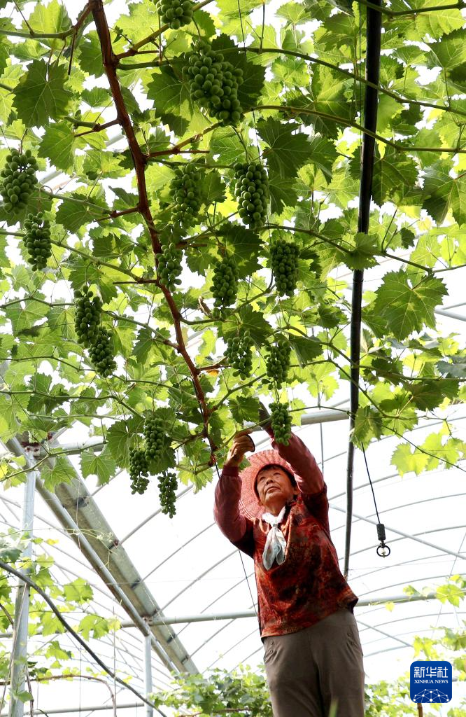 6月20日,山东省滨州市博兴县庞家镇的农民在管理葡萄。新华社发(初宝瑞摄)