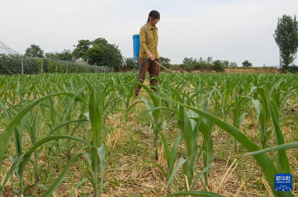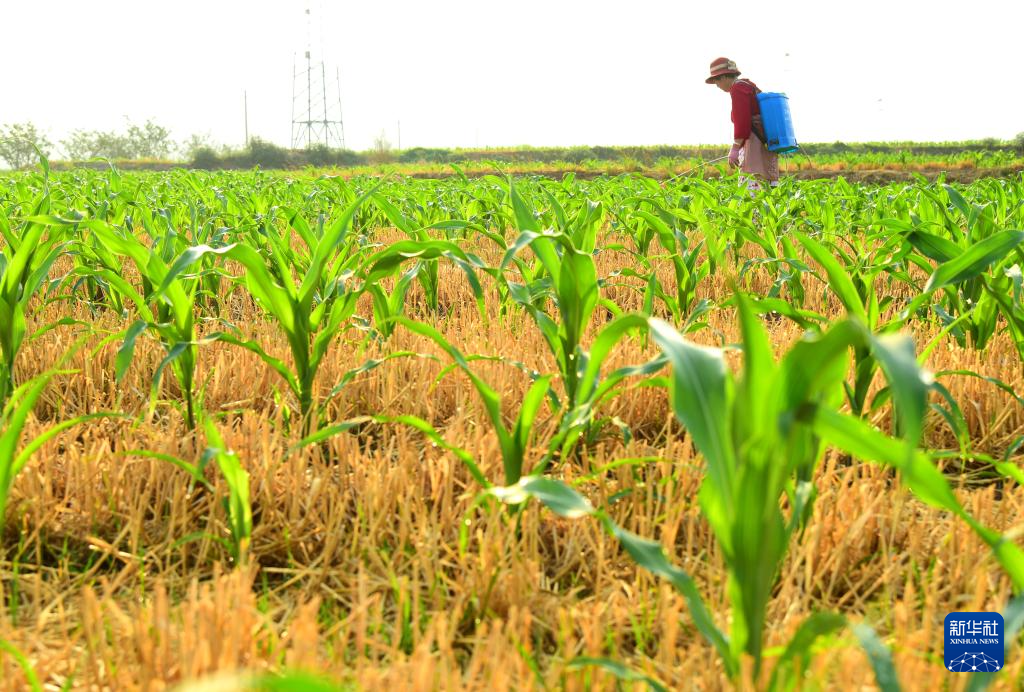 6月20日,河南省平顶山市宝丰县闹店镇司庄村村民为玉米地喷洒除草剂。新华社发(何五昌摄)