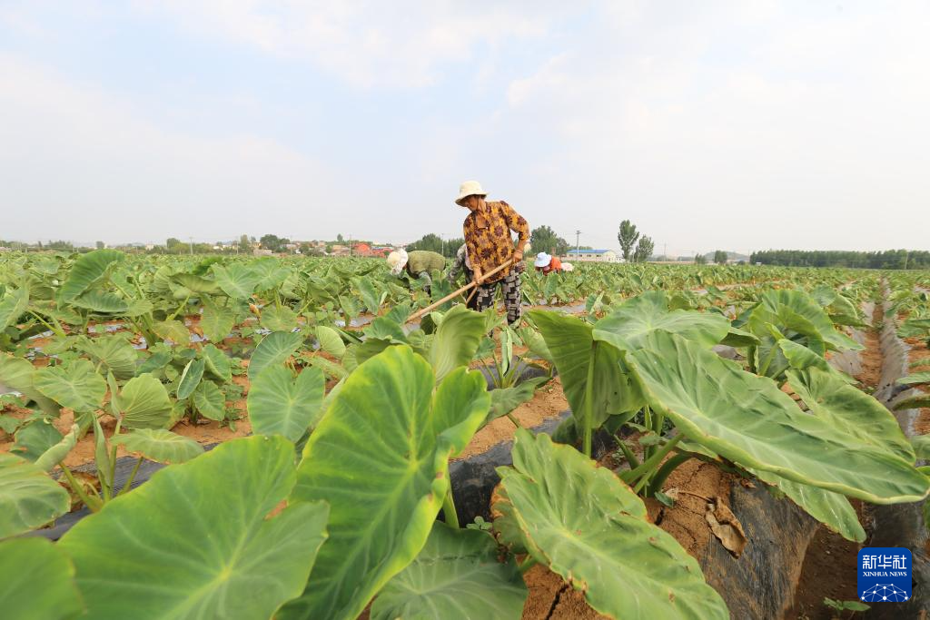 6月20日,农民在山东省枣庄市山亭区西集镇刘庄村毛芋头种植基地除草。新华社发(刘明摄)