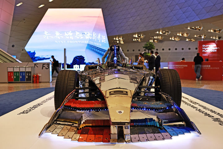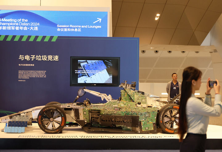 另一处展台上,摆放着一辆造型独特的纯电动赛车,名为“与电子垃圾竞速”。这辆赛车全部由智能手机、笔记本电脑、游戏机、电缆等废弃电子垃圾制造,凸显循环利用的理念。