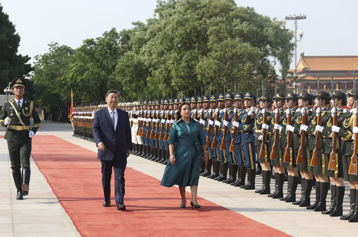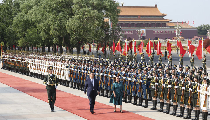 6月28日下午,国家主席习近平在北京人民大会堂同来华进行国事访问的秘鲁总统博鲁阿尔特举行会谈。这是会谈前,习近平在人民大会堂东门外广场为博鲁阿尔特举行欢迎仪式。新华社记者 刘卫兵 摄